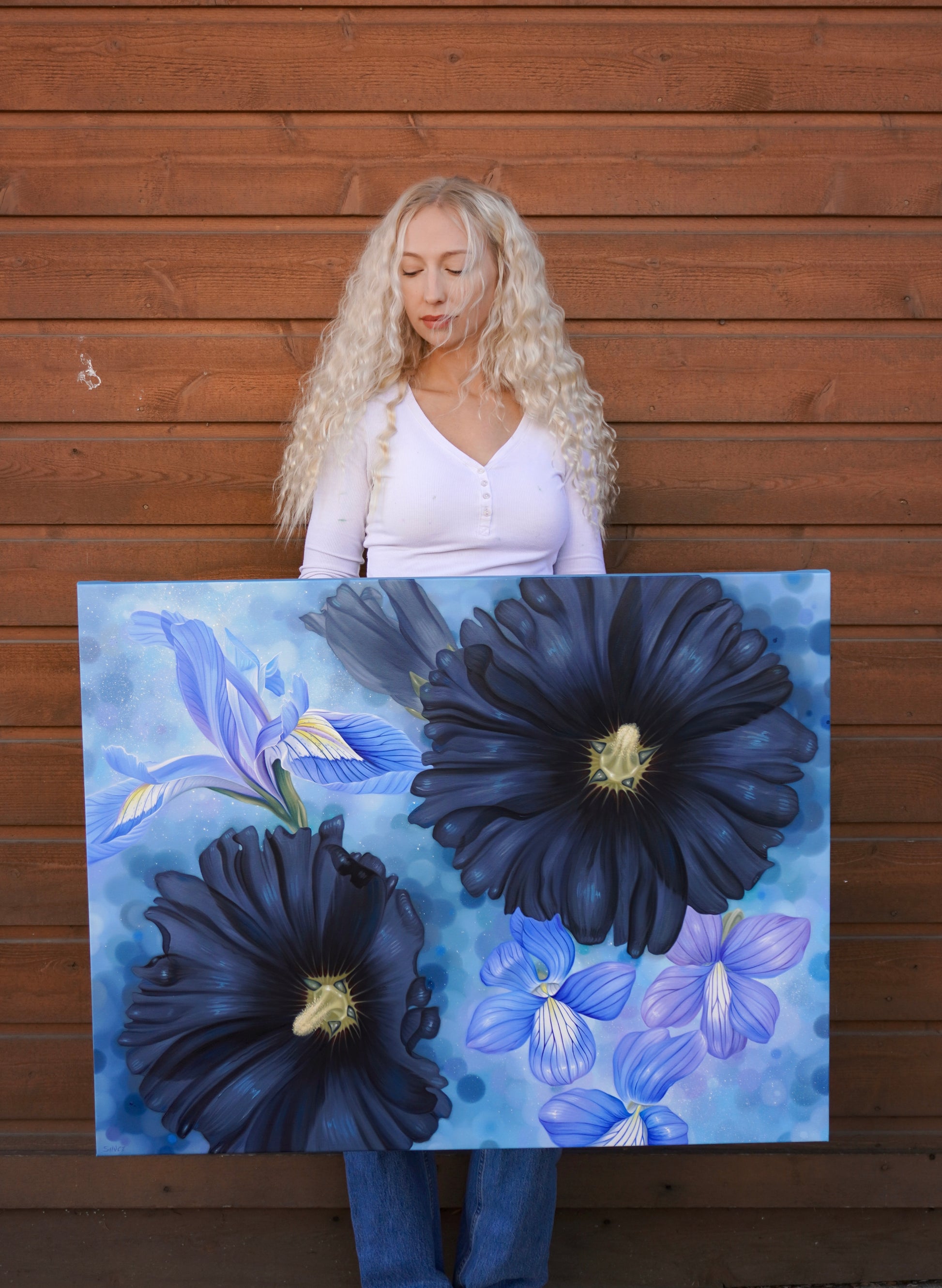 28" x 36" oil on stretched linen. Hand signed and dated on the back. Certificate of Authenticity (COA) and custom framing included with purchase.
