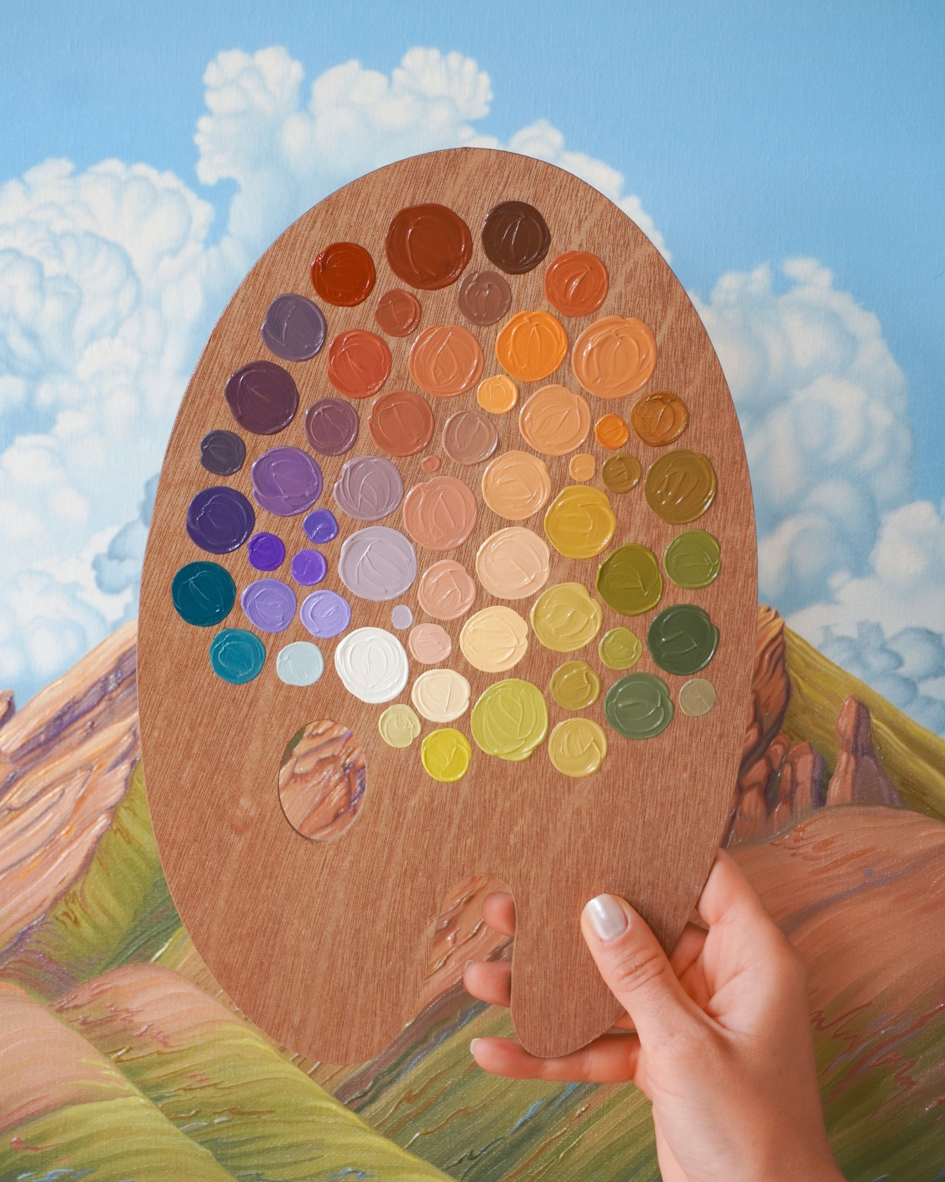 These colors led to the creation of my original oil painting titled "In the Clouds". To create this palette, I carefully applied the remaining paint from my working glass palette to a primed wood replica. After several months of drying time, I applied a gloss varnish to protect the surface and bring life and vibrancy back to the paints.