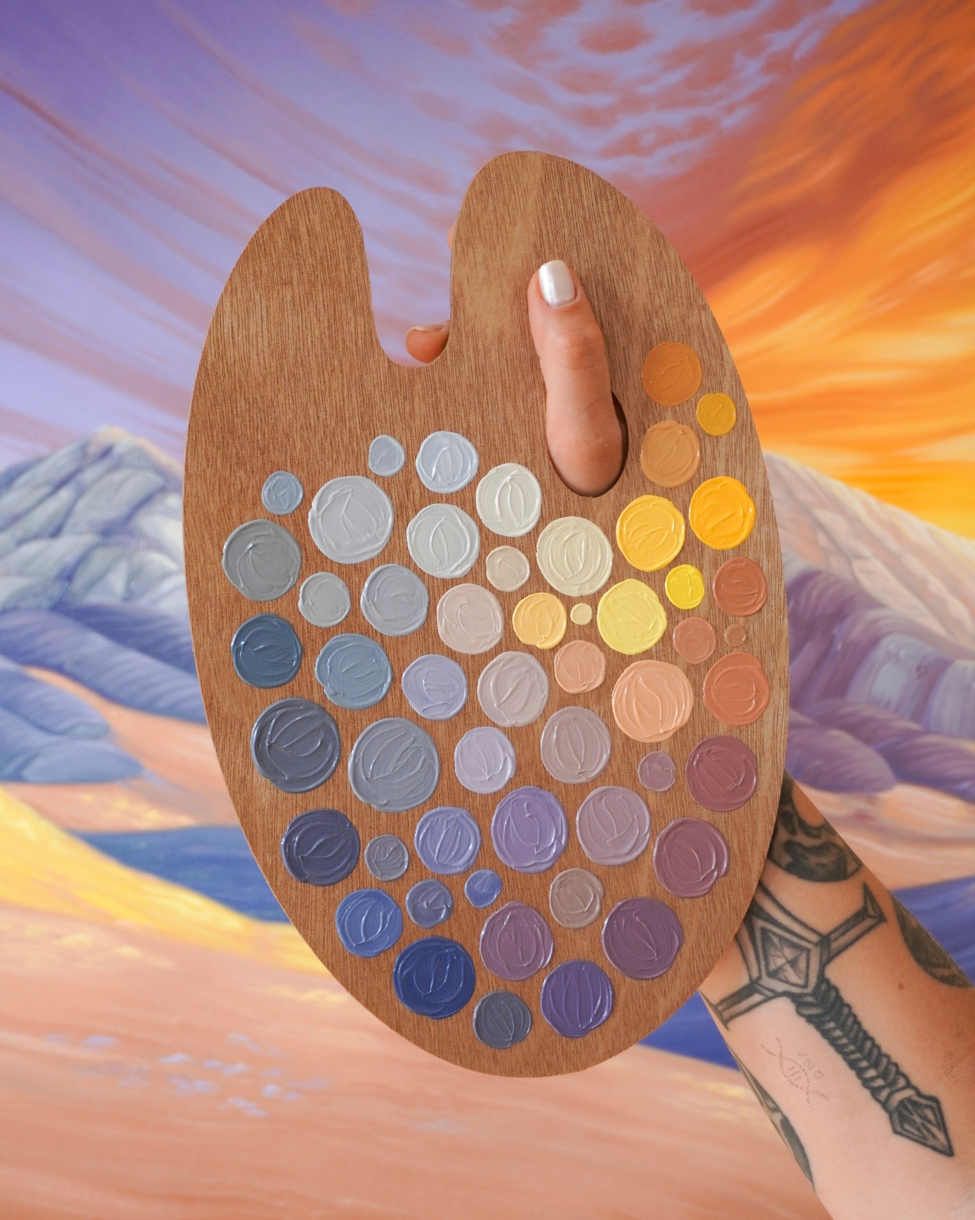 These colors led to the creation of my original oil painting titled "Peeping Purple". To create this palette, I carefully applied the remaining paint from my working glass palette to a primed wood replica. After several months of drying time, I applied a gloss varnish to protect the surface and bring life and vibrancy back to the paints.