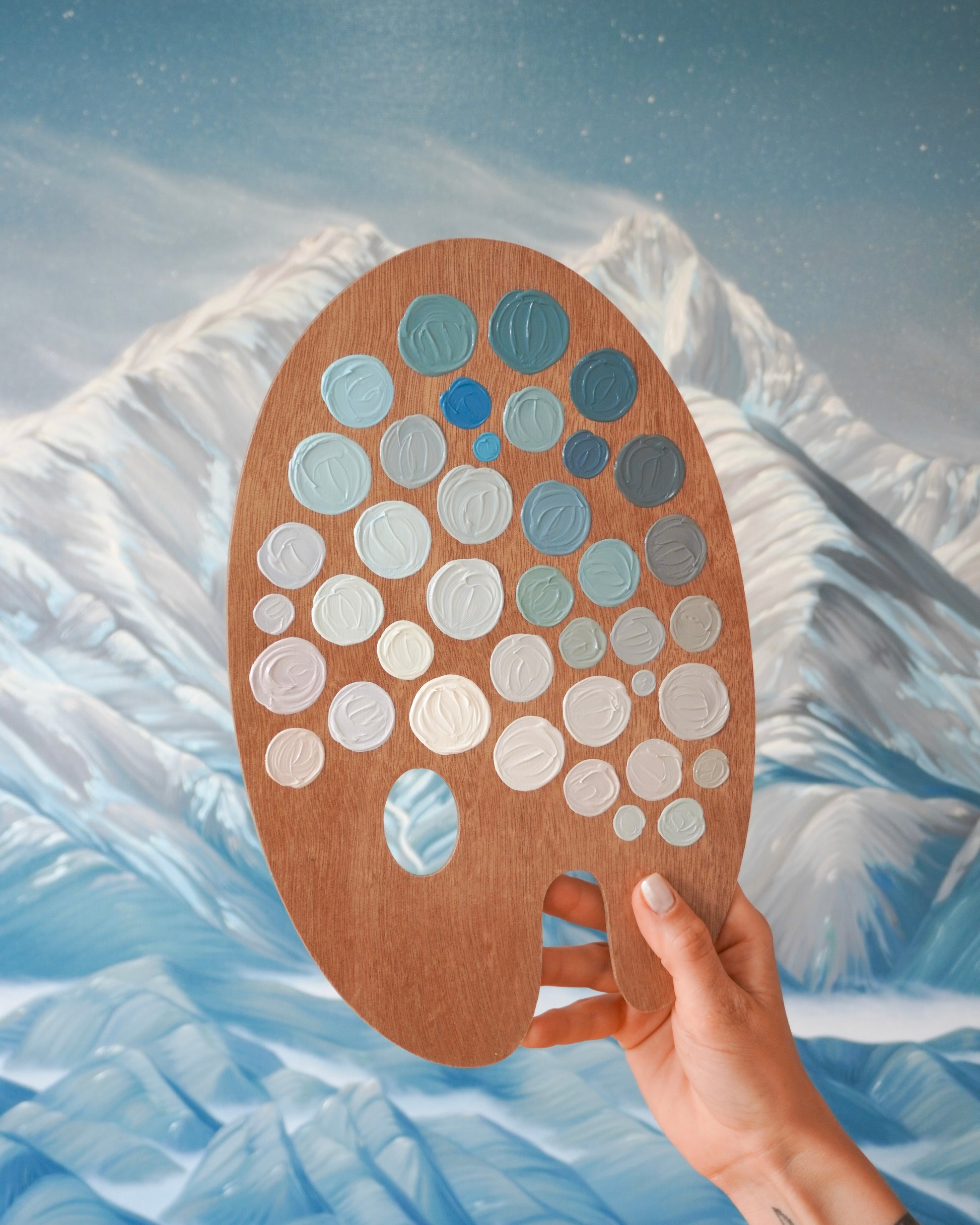 These colors led to the creation of my original oil painting titled "Winter Wardens". To create this palette, I carefully applied the remaining paint from my working glass palette to a primed wood replica. After several months of drying time, I applied a gloss varnish to protect the surface and bring life and vibrancy back to the paints.